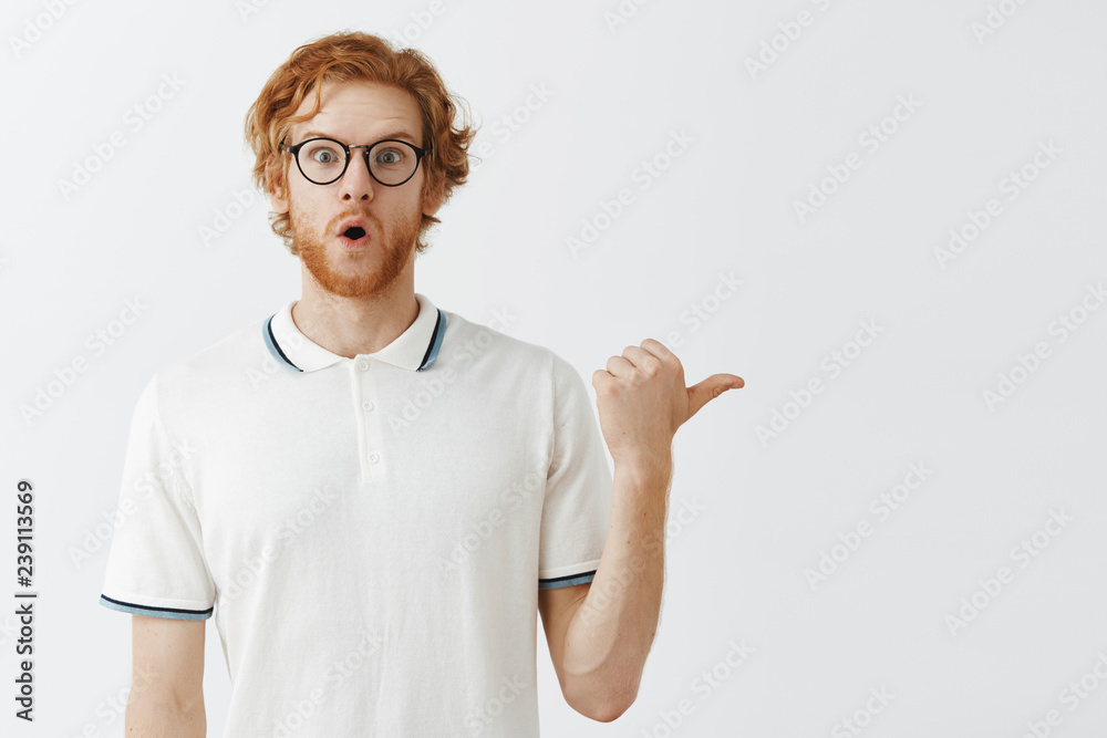 Impressed And Surprised Emotive Attractive Redhead Guy Wtih Beard And Messy Hair In Black Trendy Glasses Dropping Jaw Gasping And Raising Eyebrows From Amazement Pointing Right With Thumb Stock Photo Adobe